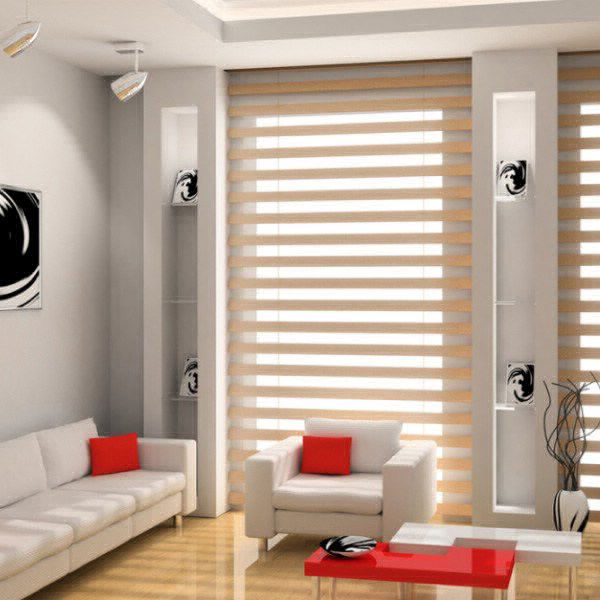 Soft horizontal fabric slats are interspersed with sheer material, which is then looped onto a headrail and bottom rail, leading to the double effect. By slight operation various combinations of fabric positions are possible: sheer material front and back allowing for maximum natural light; sheer material with fabric slat for a more muted feel; or fabric slat front and back to darken a room.