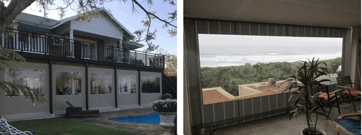 Outdoor cord operated drop blind. A neat and Affordable option to close off your patio or lapa. Available as free hang with hold down cleats or add zips on the side for a watertight seal. Blinds can also be joined together with zips to cover large areas. There are a variety of fabrics and colours to choose from as well as a pvc clear window option..