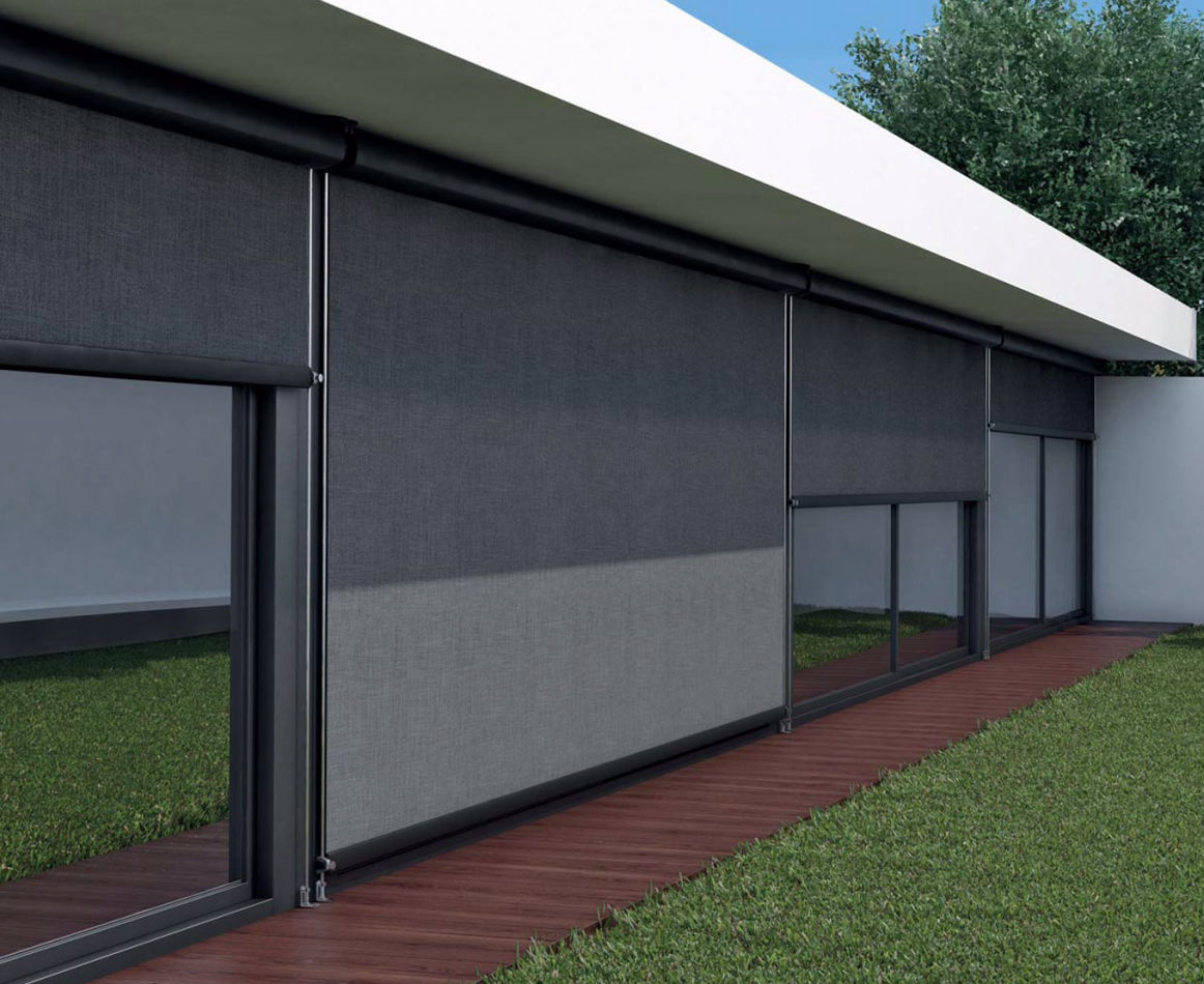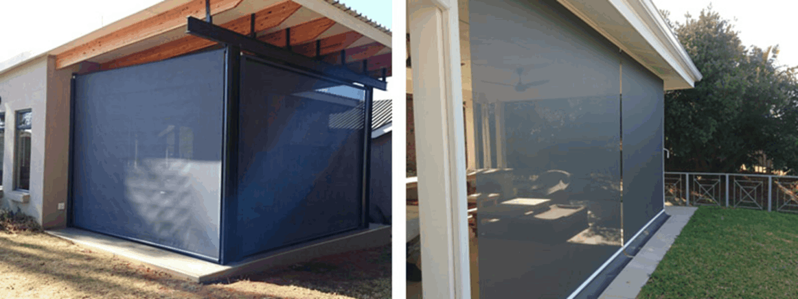Outdoor Gear or Automated roller blinds. Perfect for closing off your patio for a clean and modern look. Available as free hang with hold down brackets or add tracks with side guide system to seal off the blind completely. Also available with a cassette system to cover the top roller. There are a variety of fabrics and colours to choose from as well as a pvc clear window option